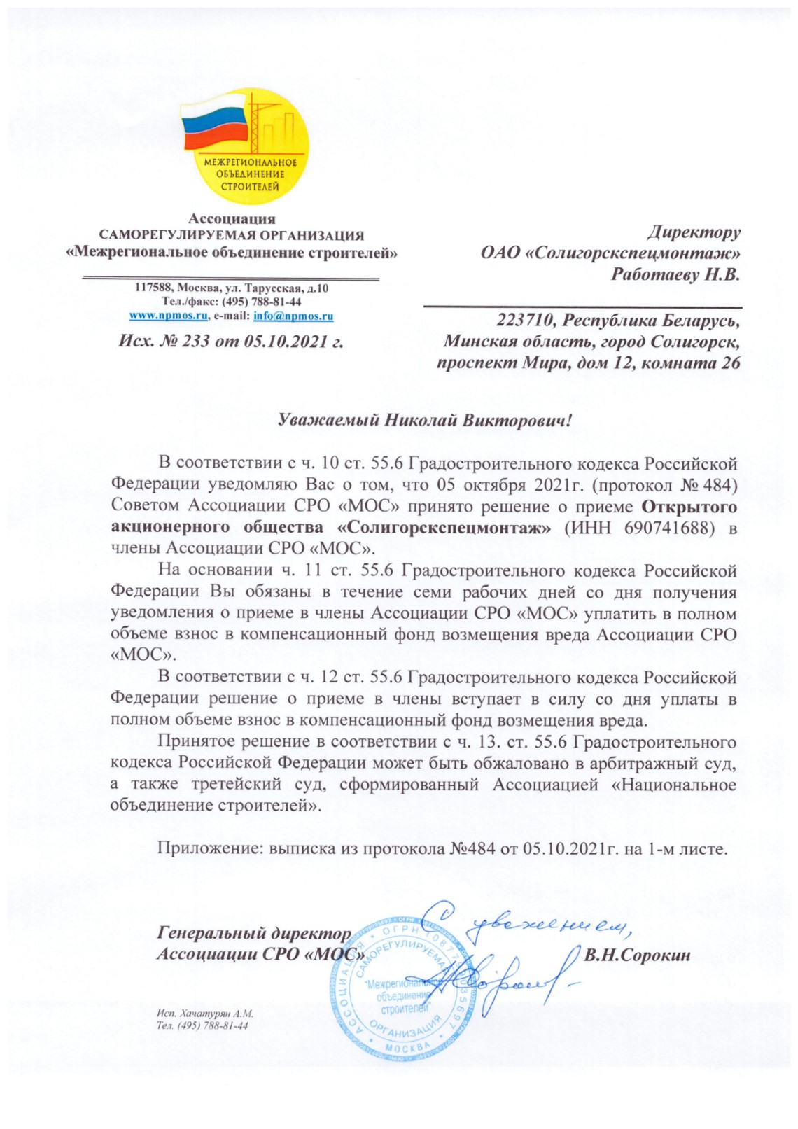 ООО «Солигорскспецмонтаж» с октября 2021 г. вступило в членство ассоциации «Саморегулируемой организации «Межрегиональное объединение строителей», что в свою очередь дает право осуществлять строительную деятельность на территории Российской Федерации.
