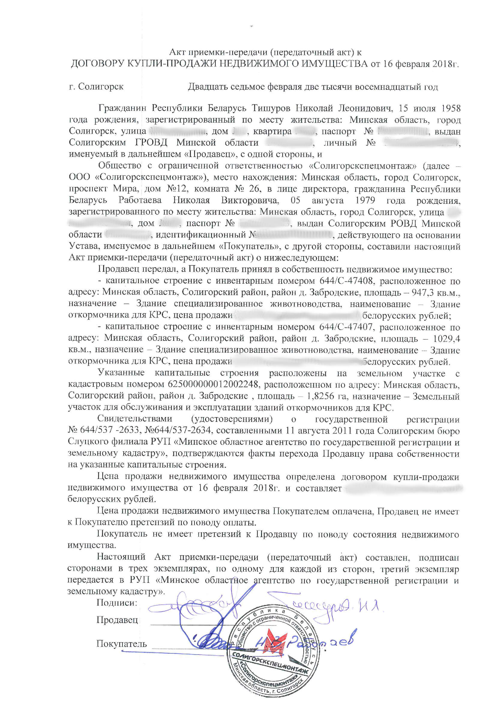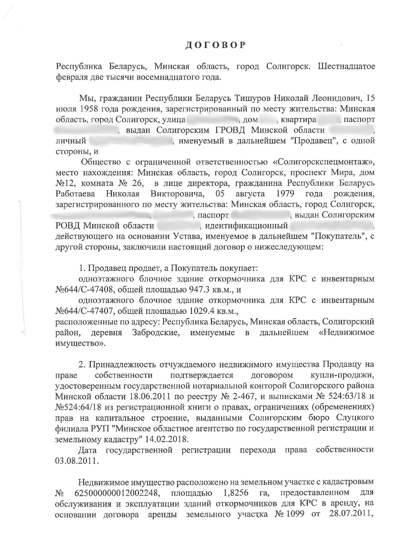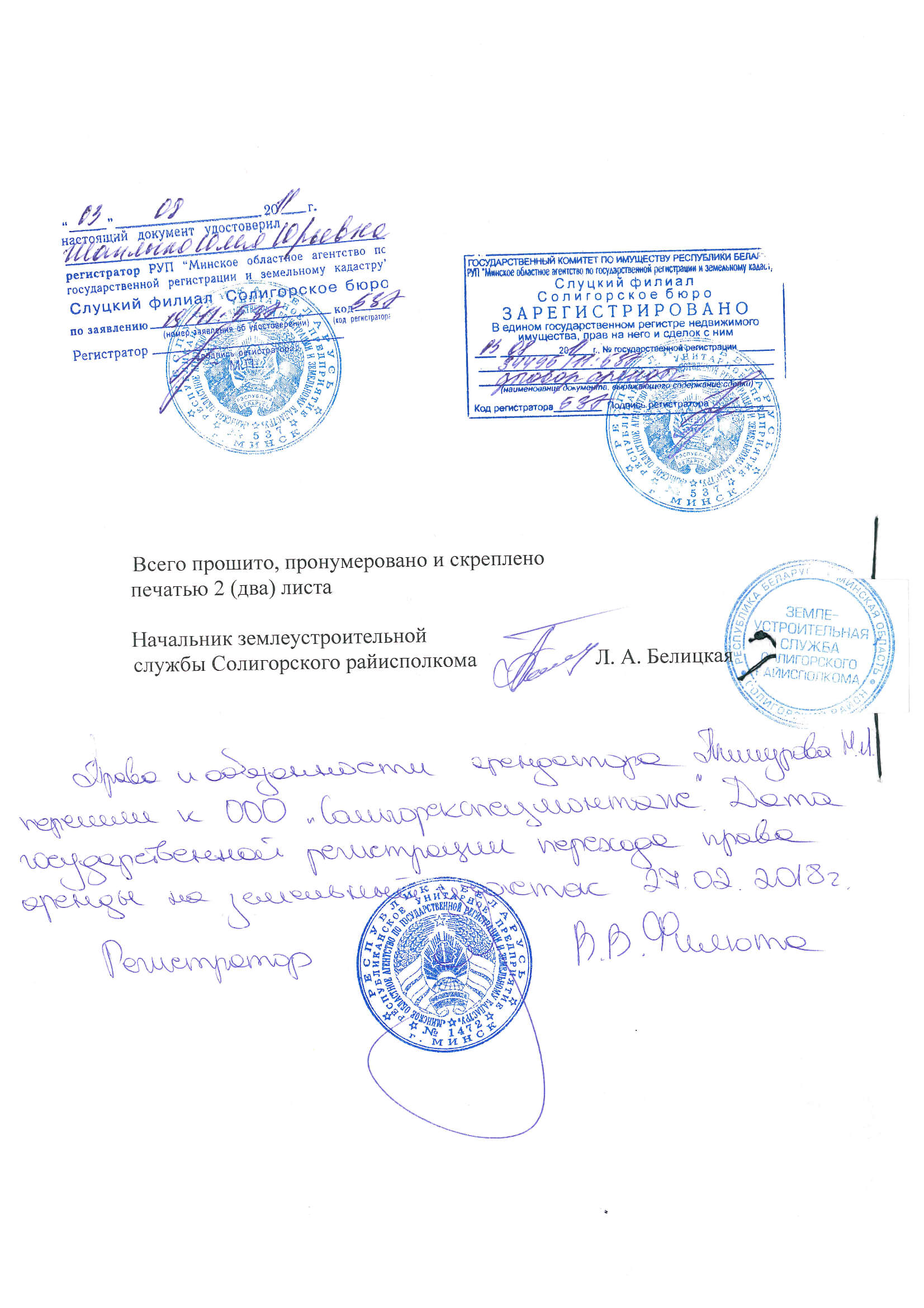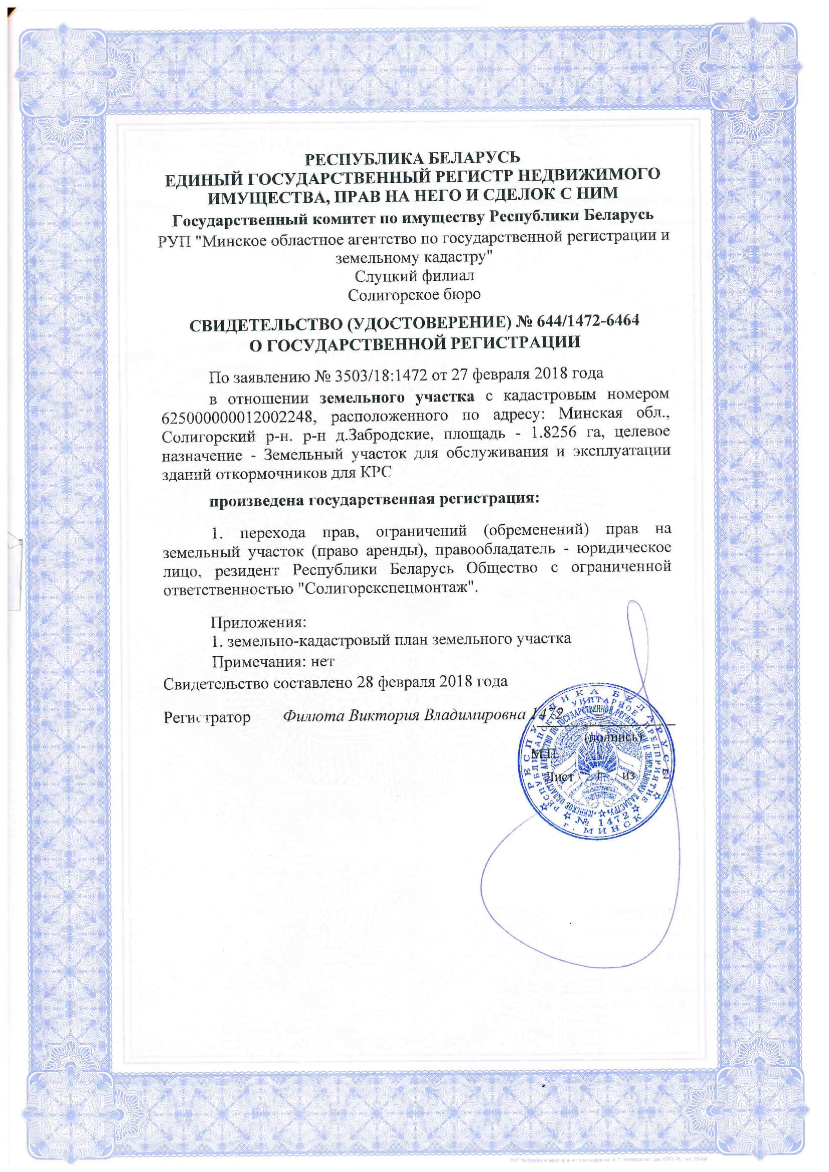 27.02.2018г. ООО «Солигорскспецмонтаж» приобрело: одноэтажное блочное здание откормочника для КРС с инв.№644/С-47408 (S-947,3м2), одноэтажное блочное здание откомочника для КРС с инв.№644/С-47407 (S-1029,4м2), расположенные по адресу, Республика Беларусь, Минская область, Солигорский район, д.Забродские. Сведения о земельном участке: кадастровый номер 625000000012002248, категория – земли промышленности, транспорта, связи, энергетики, обороны и иного назначения (дата государственной регистрации: 17.11.2010 года). Целевое назначение: Земельный участок для строительства и обслуживания производственного здания с административно-бытовым и вспомогательными зданиями и сооружениями.