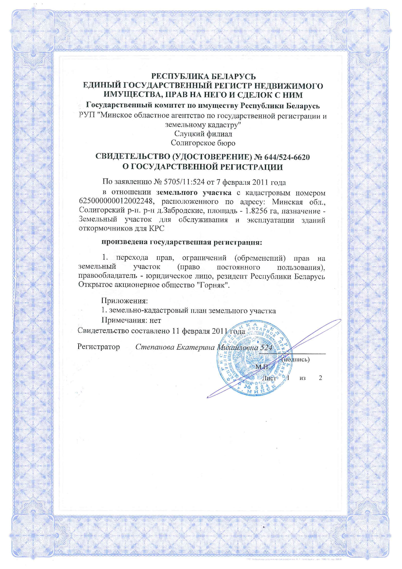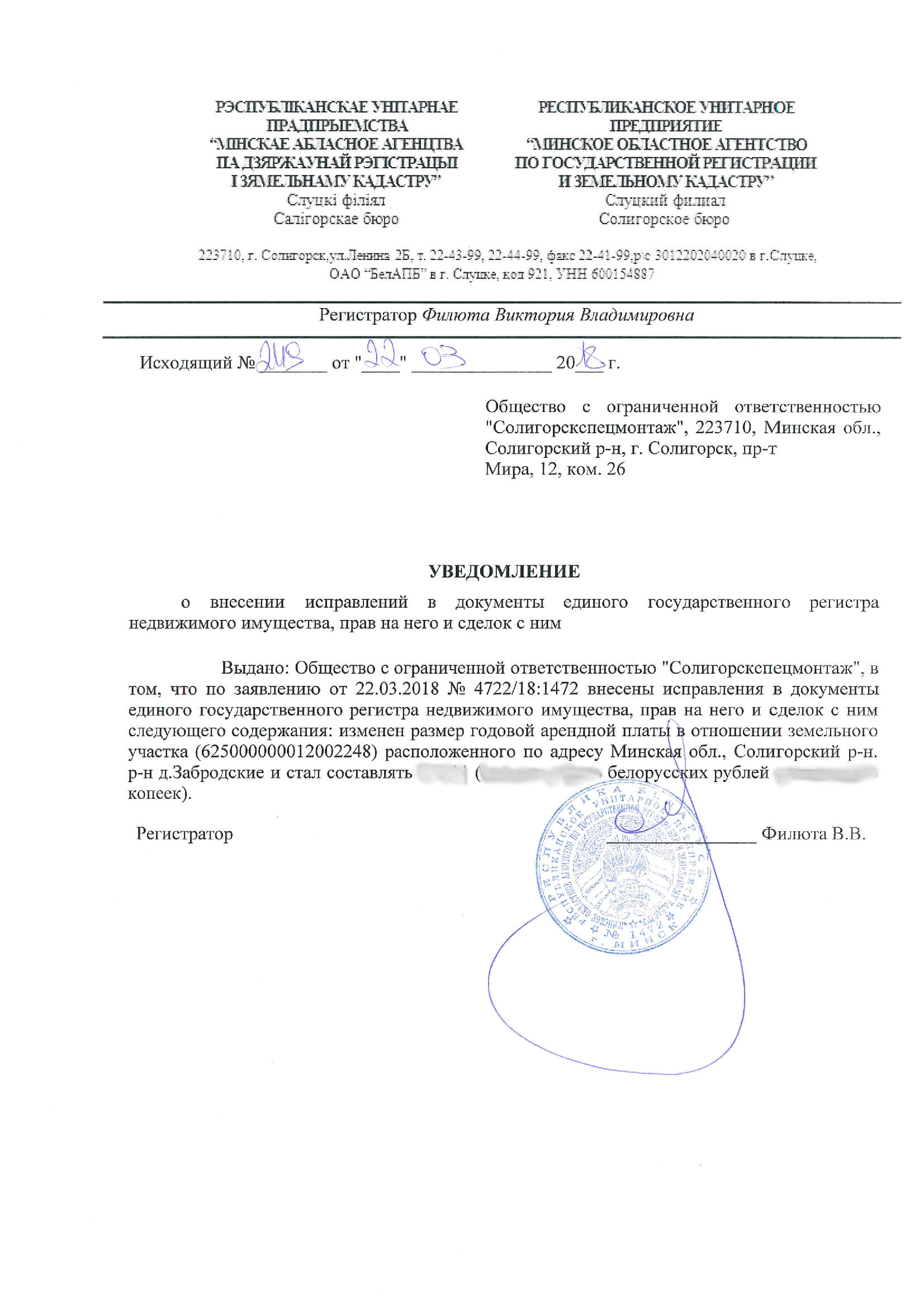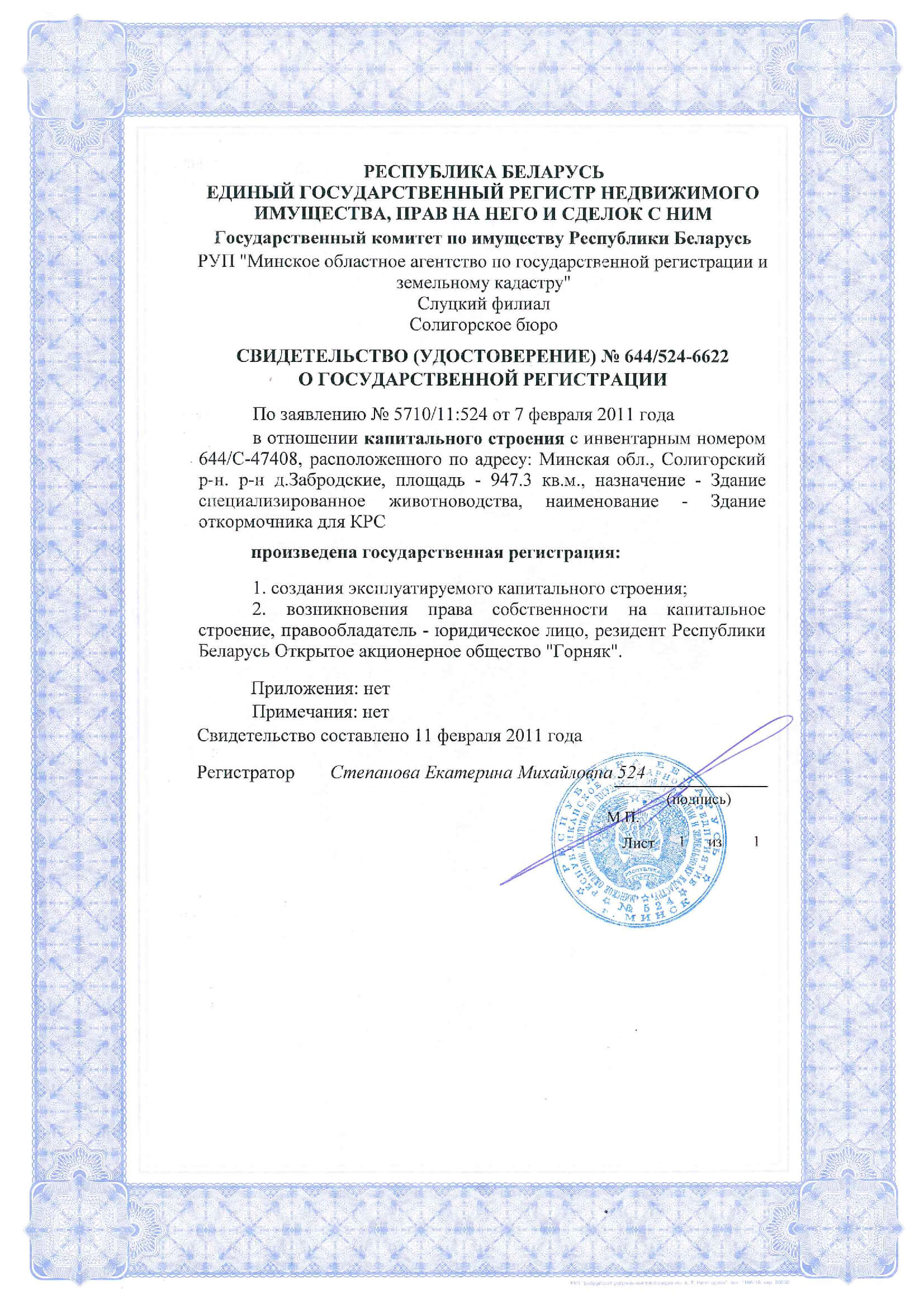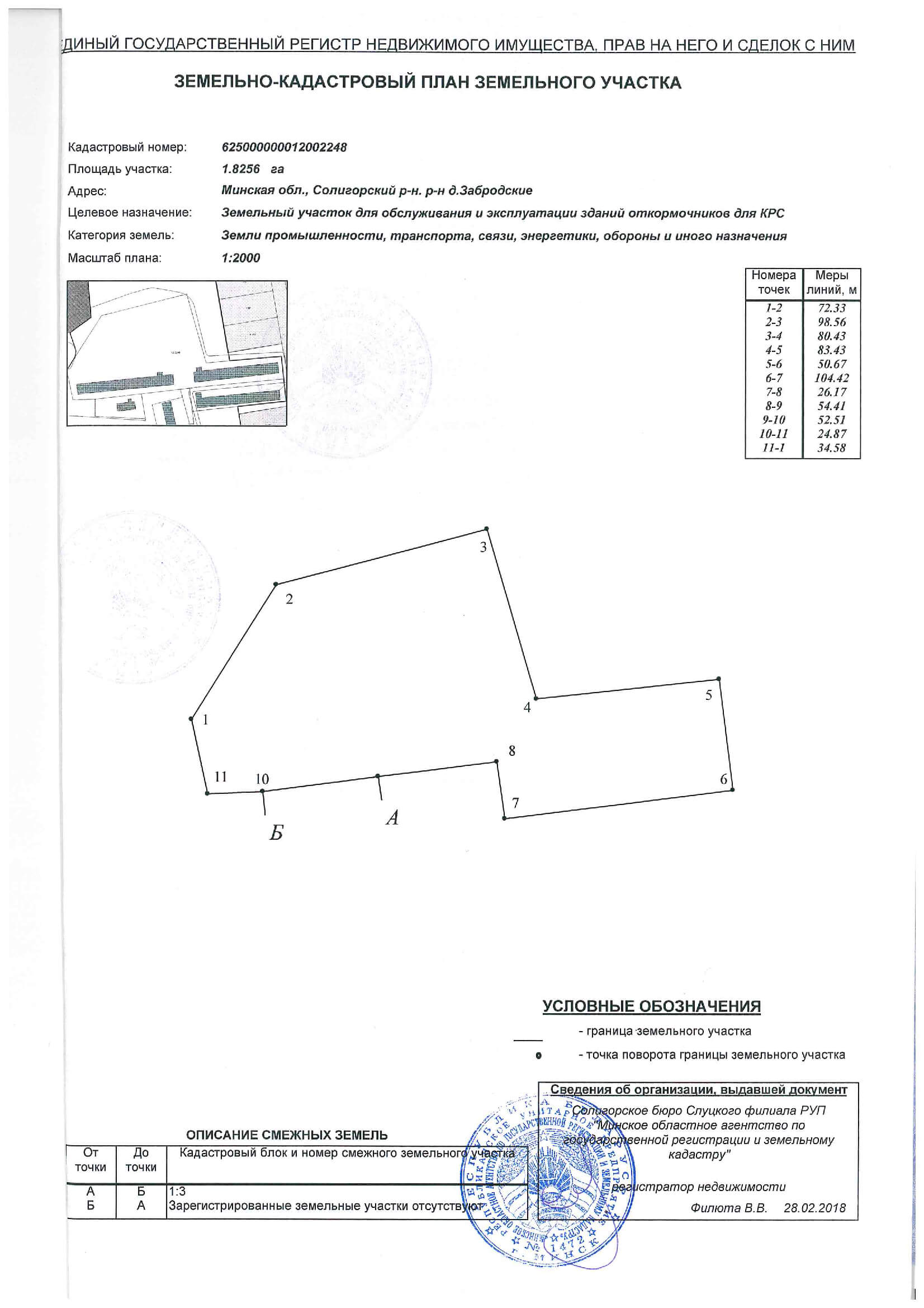 27.02.2018г. ООО «Солигорскспецмонтаж» приобрело: одноэтажное блочное здание откормочника для КРС с инв.№644/С-47408 (S-947,3м2), одноэтажное блочное здание откомочника для КРС с инв.№644/С-47407 (S-1029,4м2), расположенные по адресу, Республика Беларусь, Минская область, Солигорский район, д.Забродские. Сведения о земельном участке: кадастровый номер 625000000012002248, категория – земли промышленности, транспорта, связи, энергетики, обороны и иного назначения (дата государственной регистрации: 17.11.2010 года). Целевое назначение: Земельный участок для строительства и обслуживания производственного здания с административно-бытовым и вспомогательными зданиями и сооружениями.